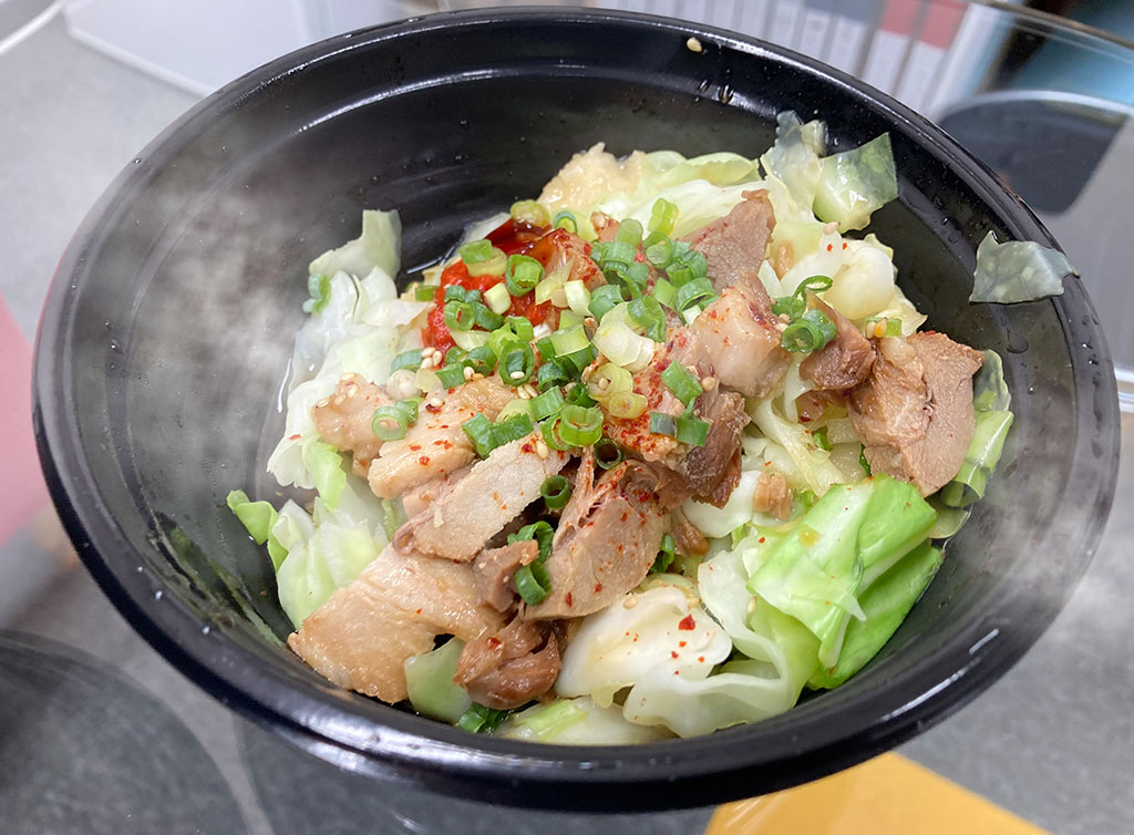 一口大に切ったキャベツに細かく切ったチャーシューにネギがパラパラ…というシンプルな構成ですが、