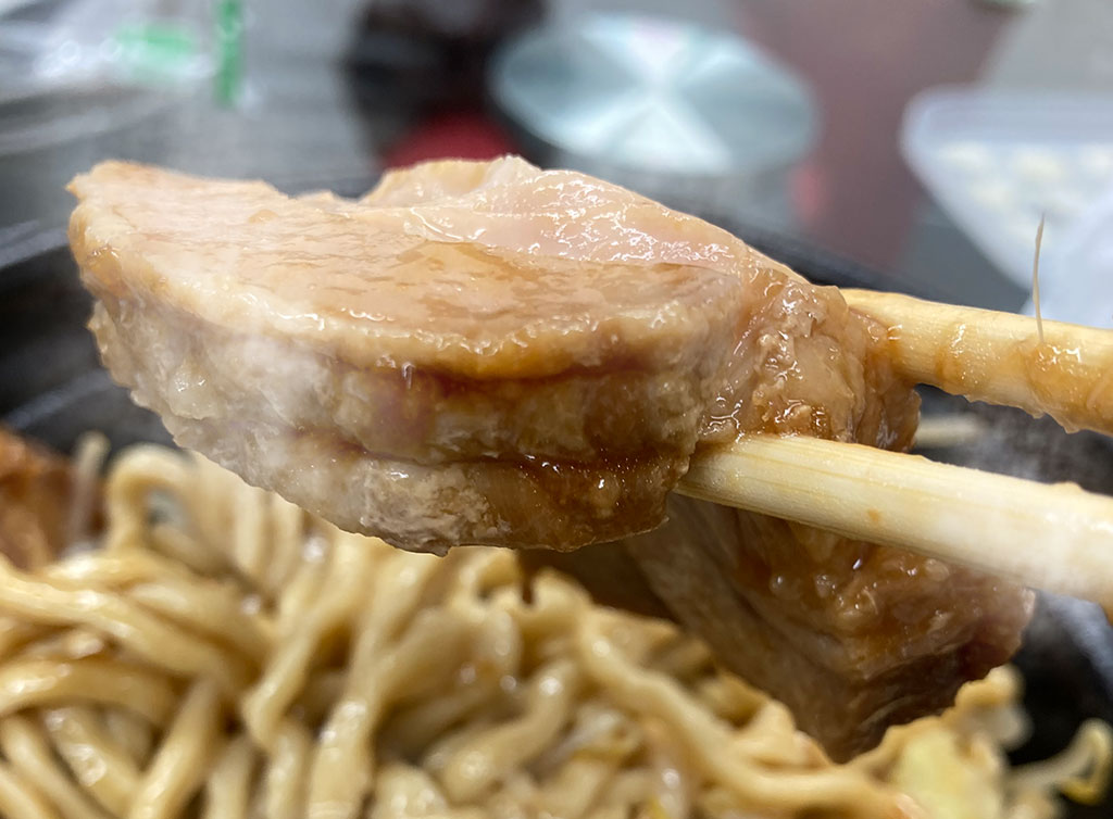 もちろん二郎系ラーメンでは必須の極厚チャーシューも御覧の通りの仕上がり。