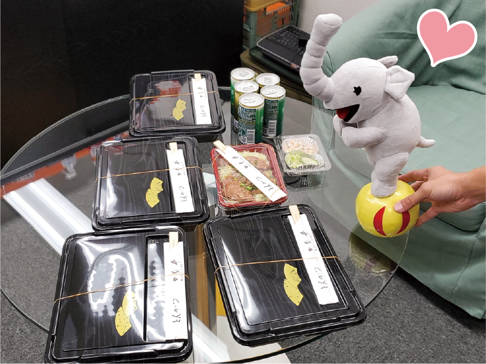 デザインデポメンバー5人中4人は、かつライス(とんかつ定食)