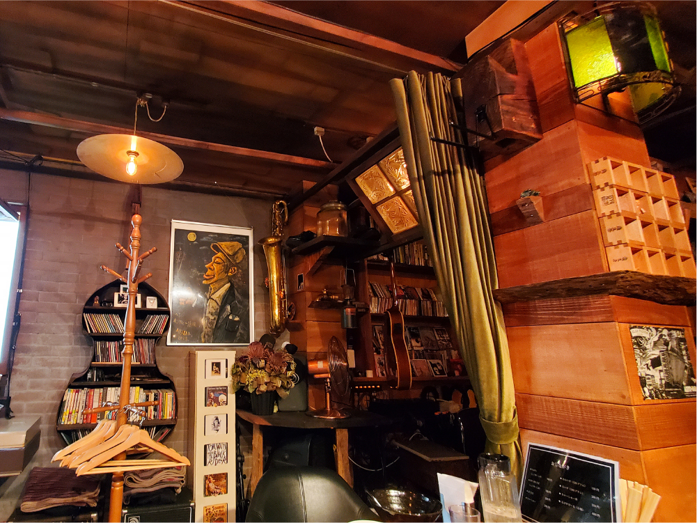 お店の中には、たくさんの楽器が飾ってあります。天井のライトが、シンバルになっていて、びっくりしました!