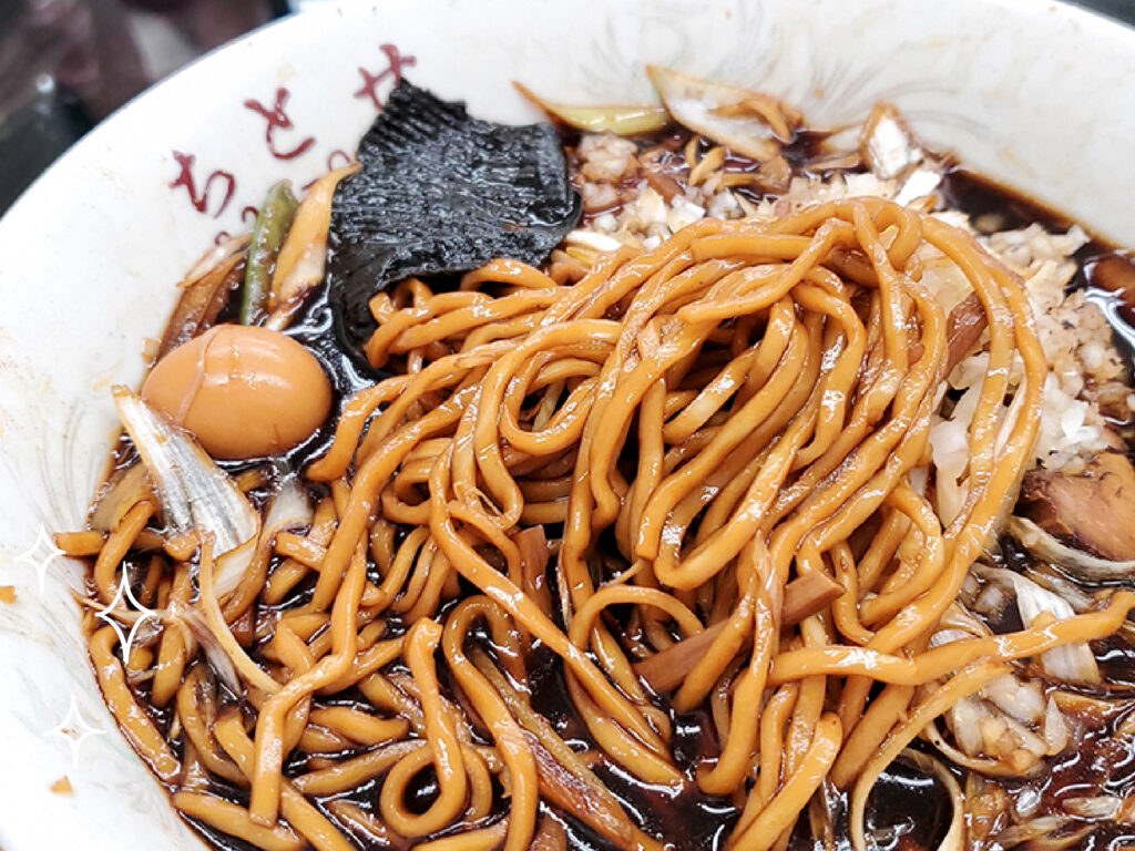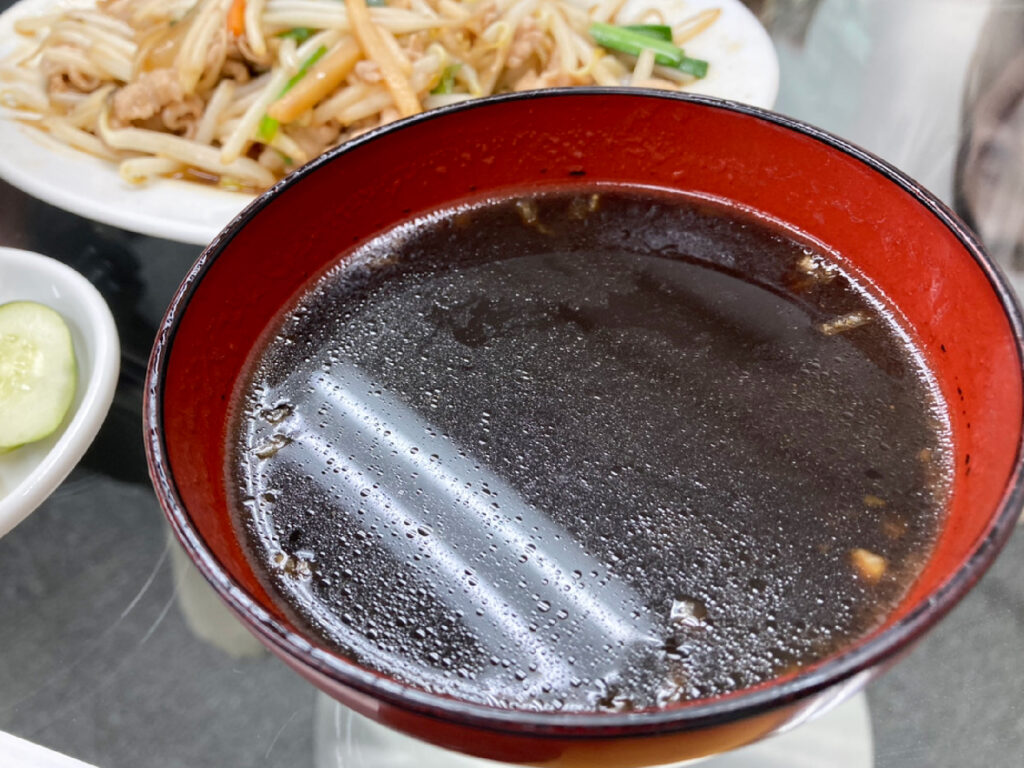 店の名物で八王子ブラックといわれているラーメンと同様のスープが、ほんのり苦めの醤油に似た味わいで、