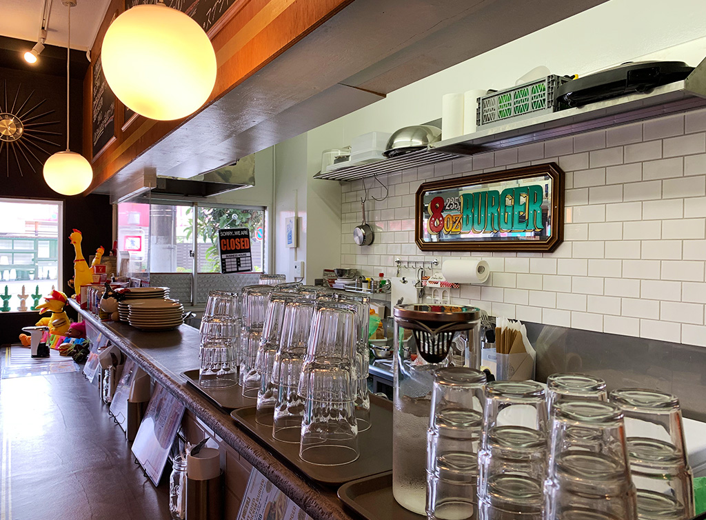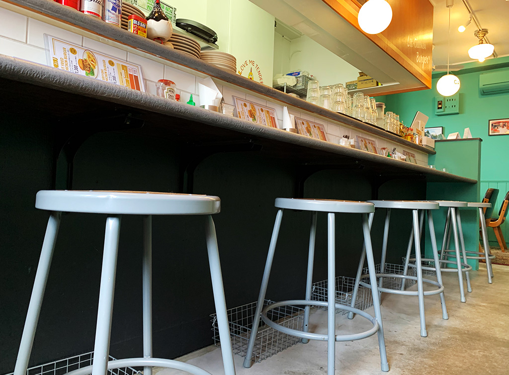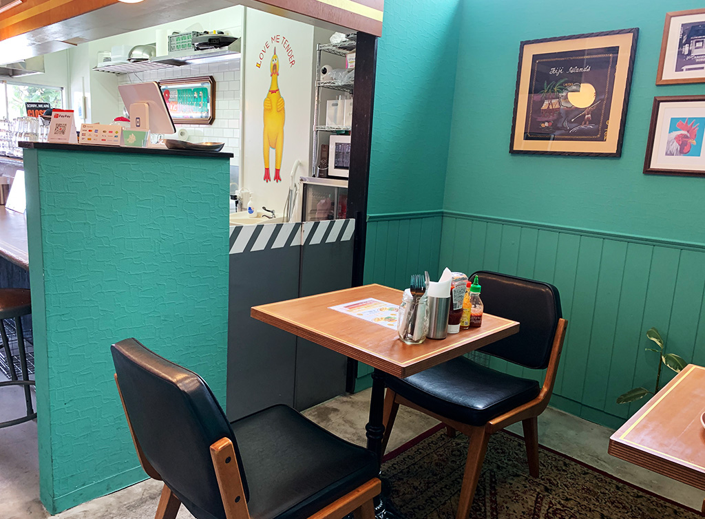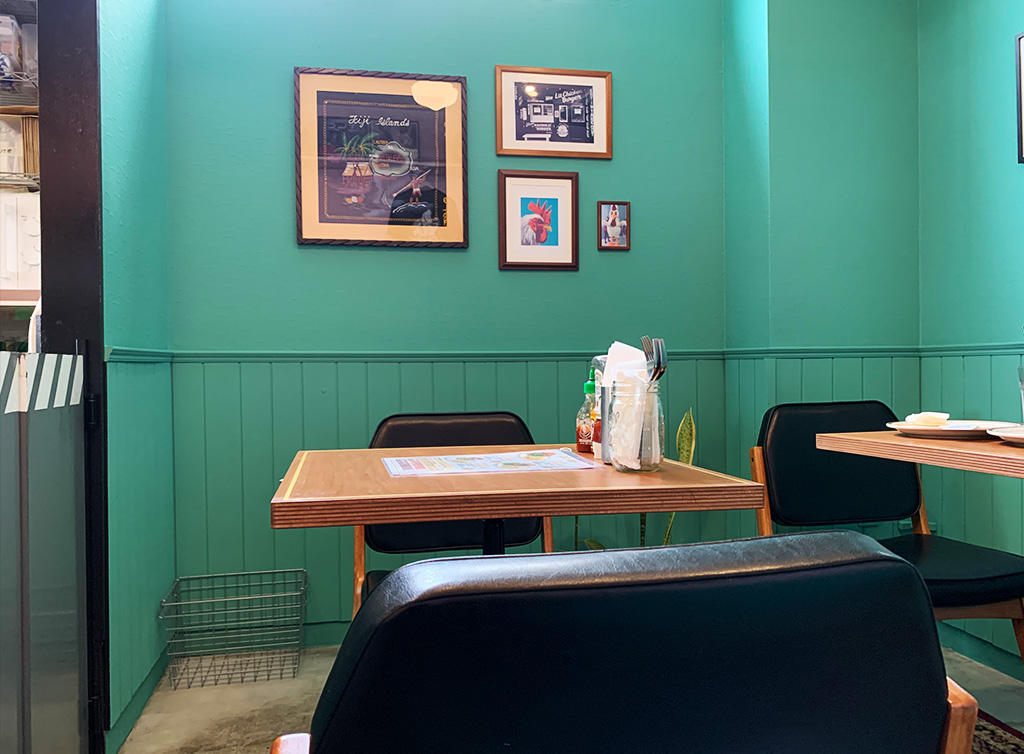 エメラルドグリーンが綺麗な内装と、アメリカンな雰囲気でおしゃれな店内です。
