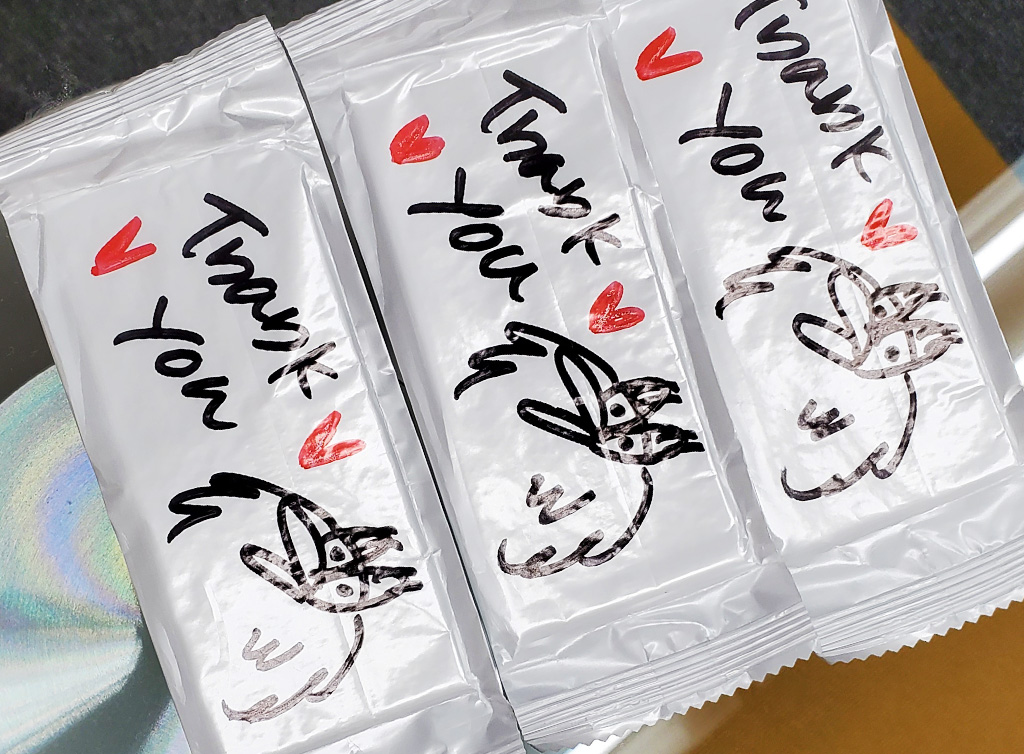 袋や包装もイラストが印刷されたかわいいデザインで、お手拭きには手書きのメッセージもありました…!