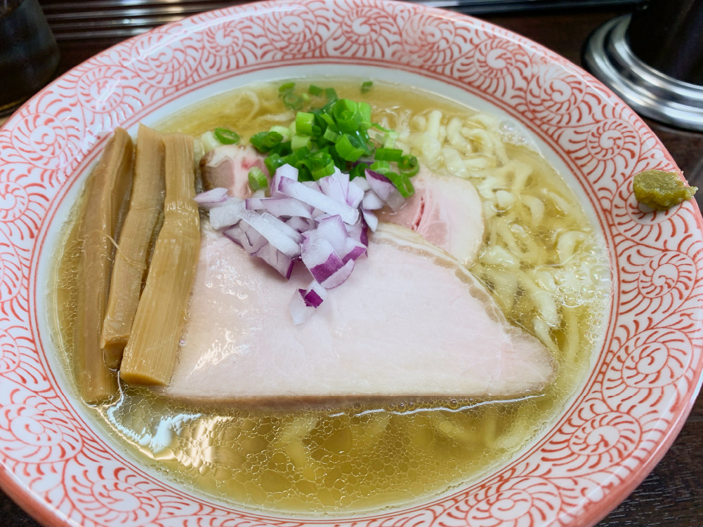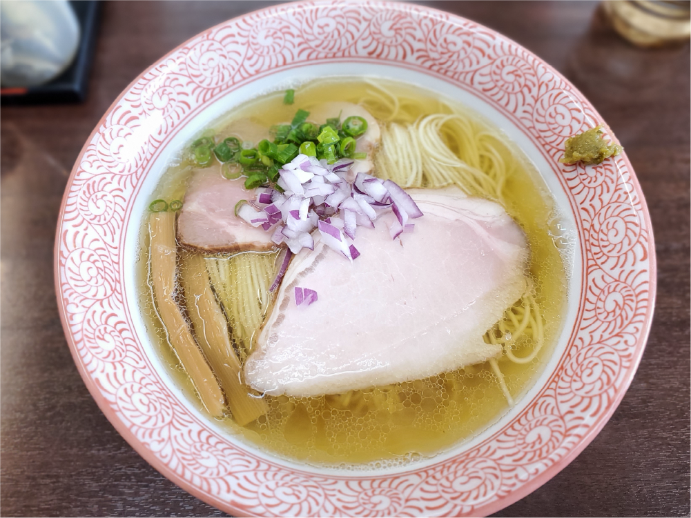 できあがったラーメンは、スープが透き通った、とてもキレイなラーメンでした。 器の端っこに、柚子胡椒が。