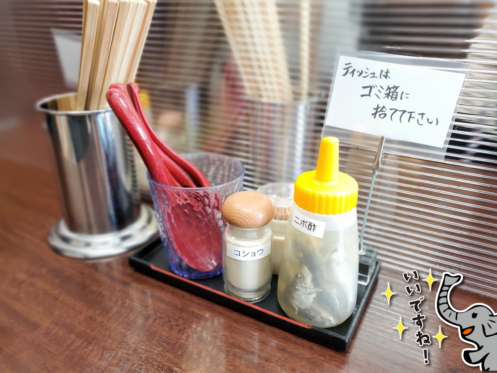カウンターのところに、お箸と調味料のセットが置いてありました。その中に、煮干しが入ったお酢もありました。