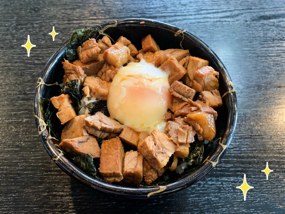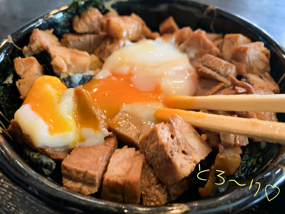 チャーシューエッグ丼は、ゴロゴロしたチャーシューと半熟卵の組み合わせが最高でぺろりと完食してしまいました!